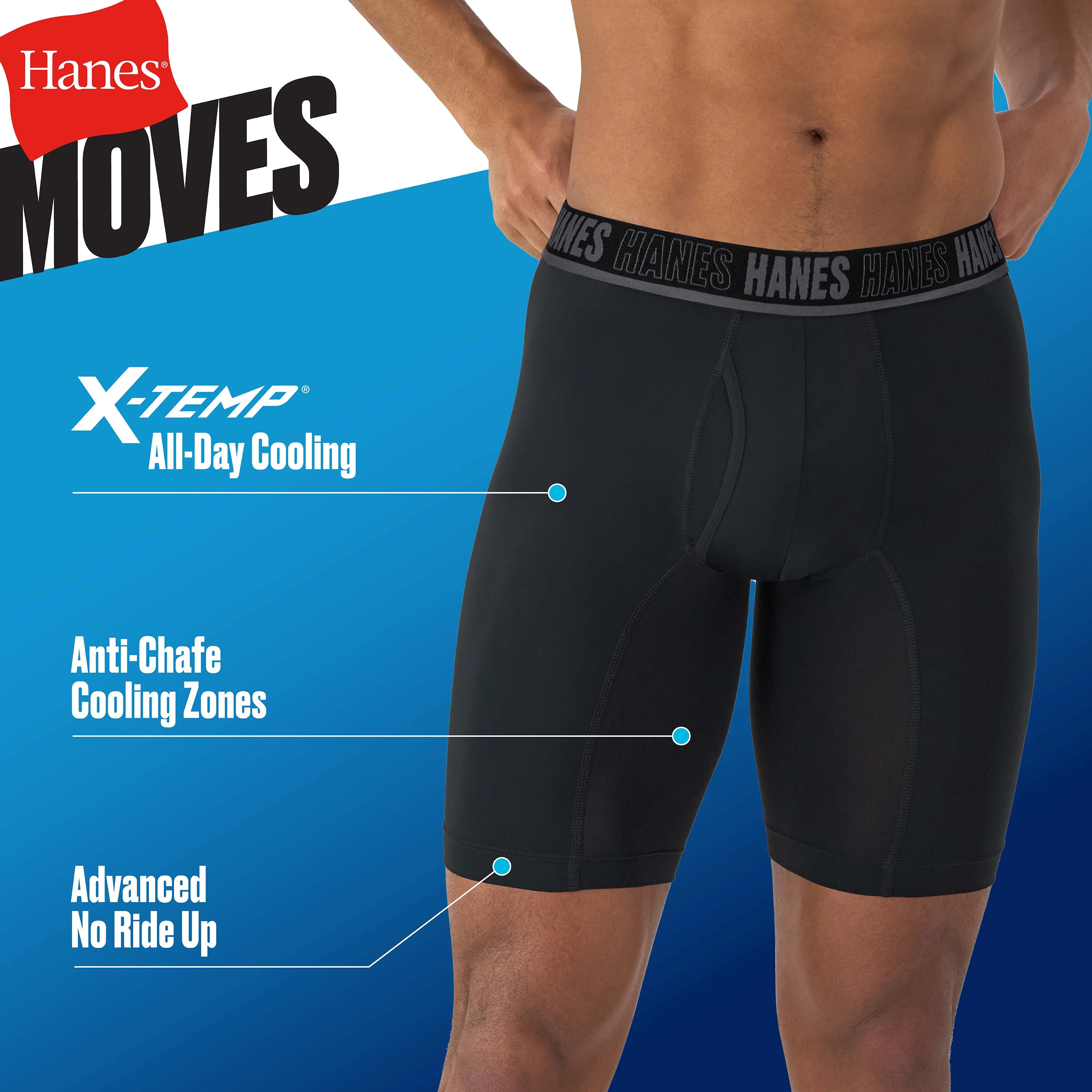 Hanes Moves Ultimate Men’s Anti-Chafe Long Leg Boxer Brief Underwear, X-Temp, 4-Pack, Black, 8